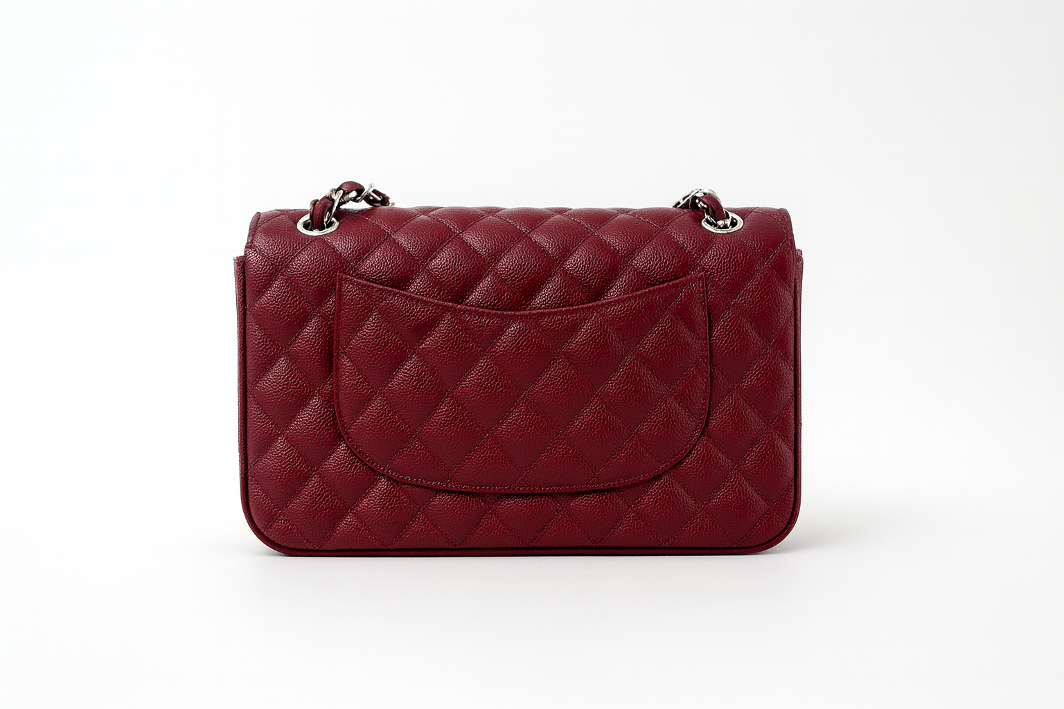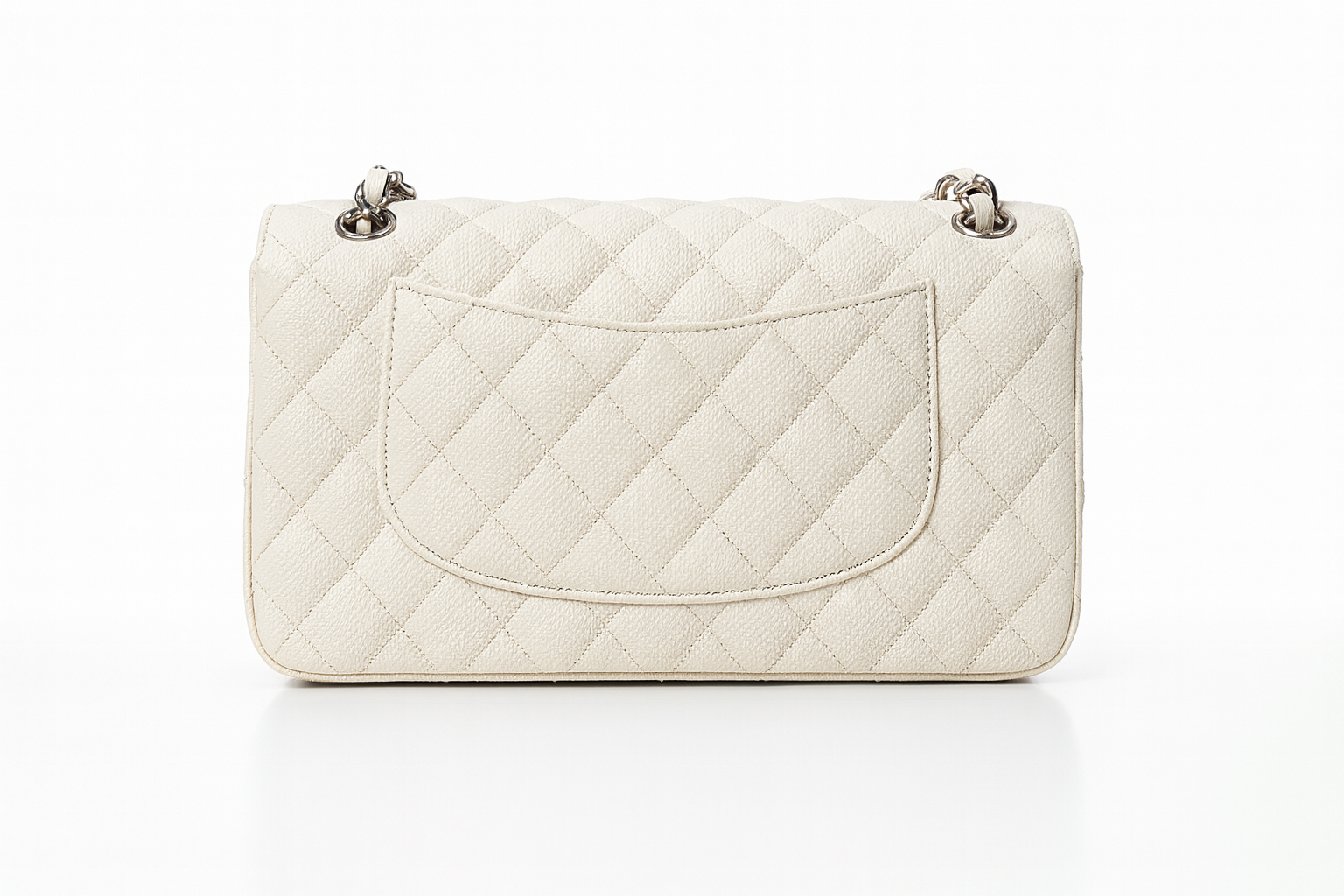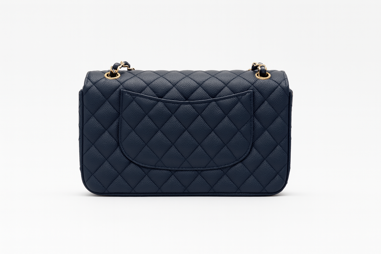 - Exterior: Quilted caviar leather with a 6 1/2" x 3 1/2" art display window and a back-panel pocket