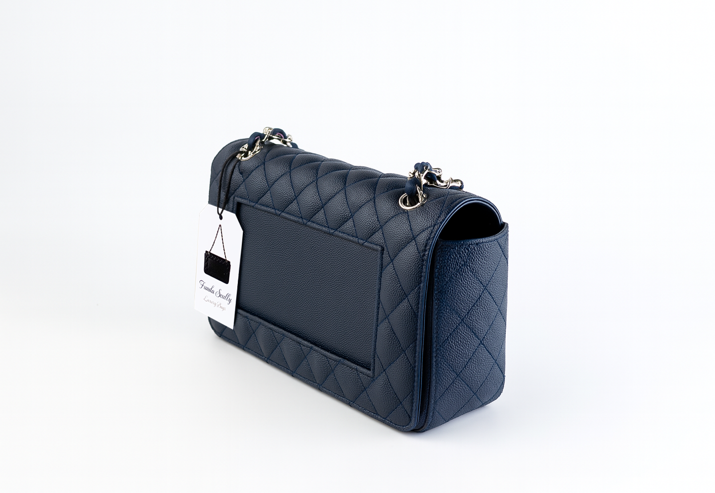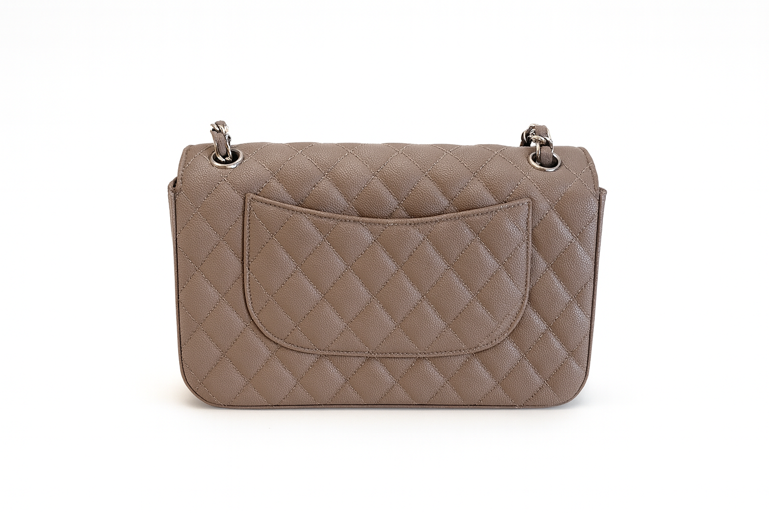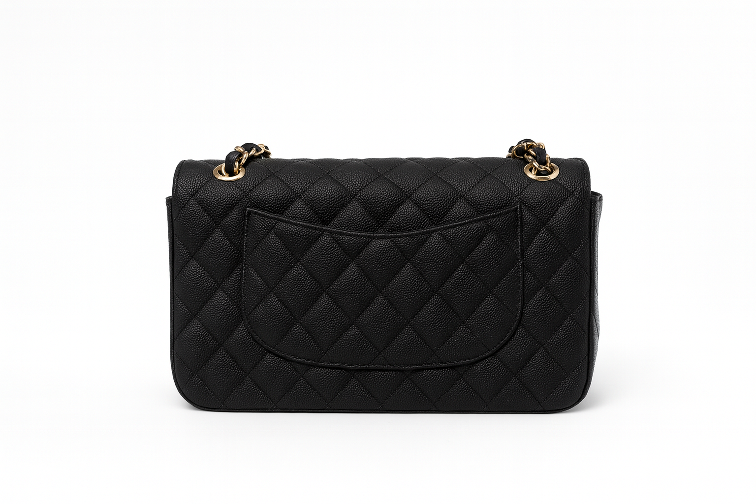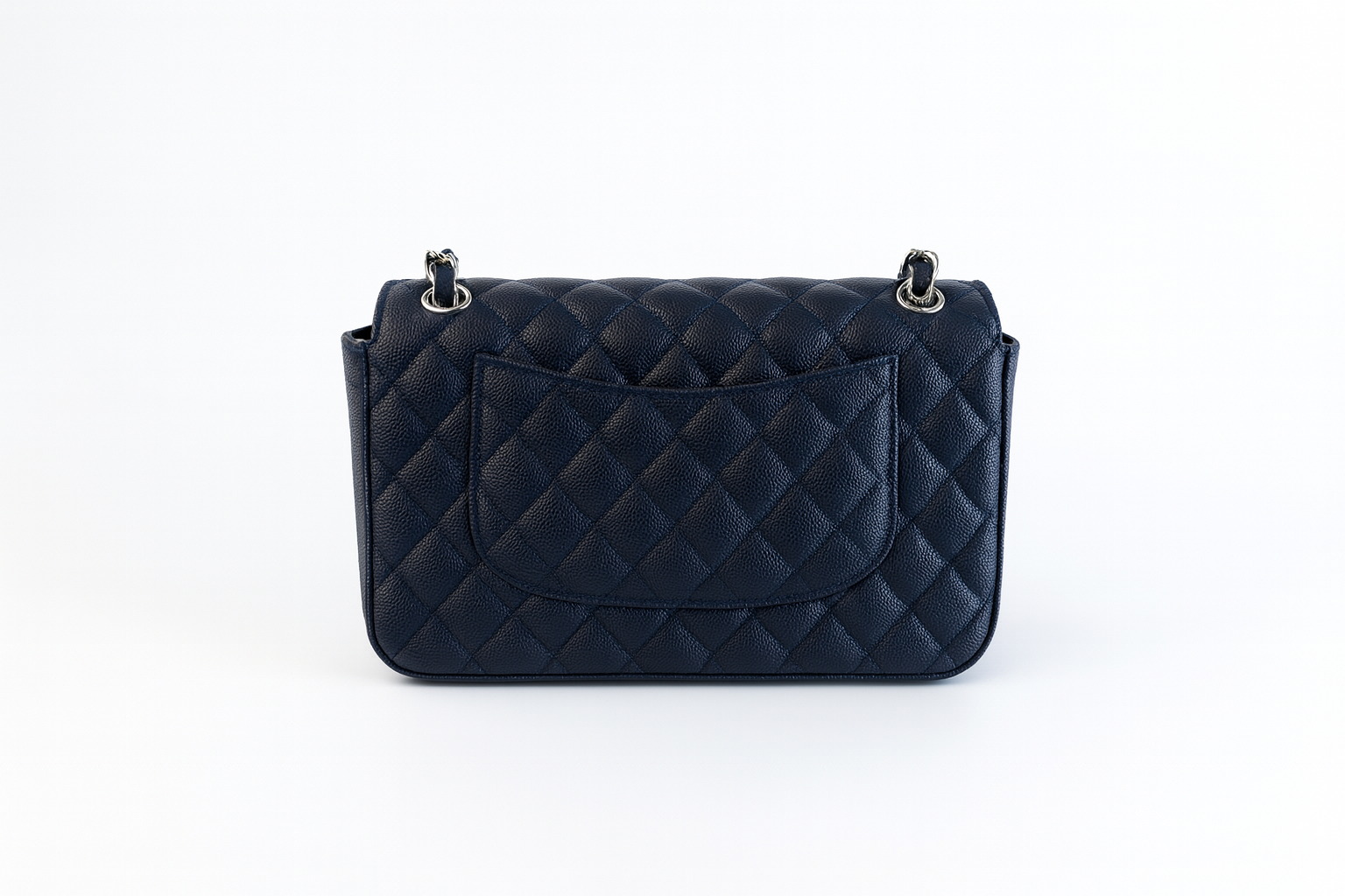 - Exterior: Quilted caviar leather with a 6 1/2" x 3 1/2" art display window and a back-panel pocket